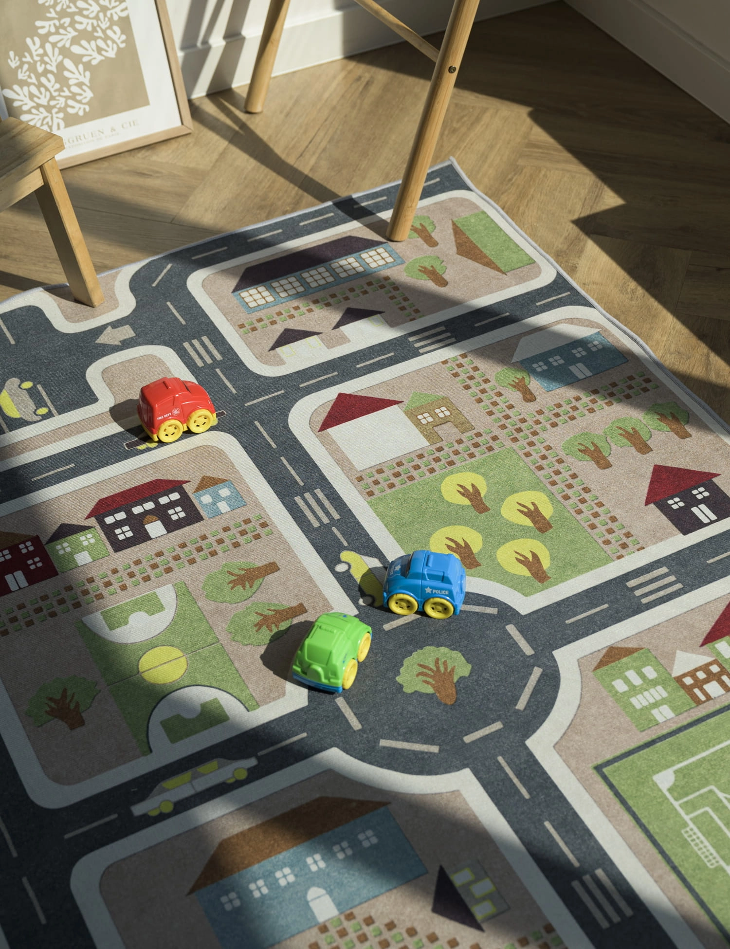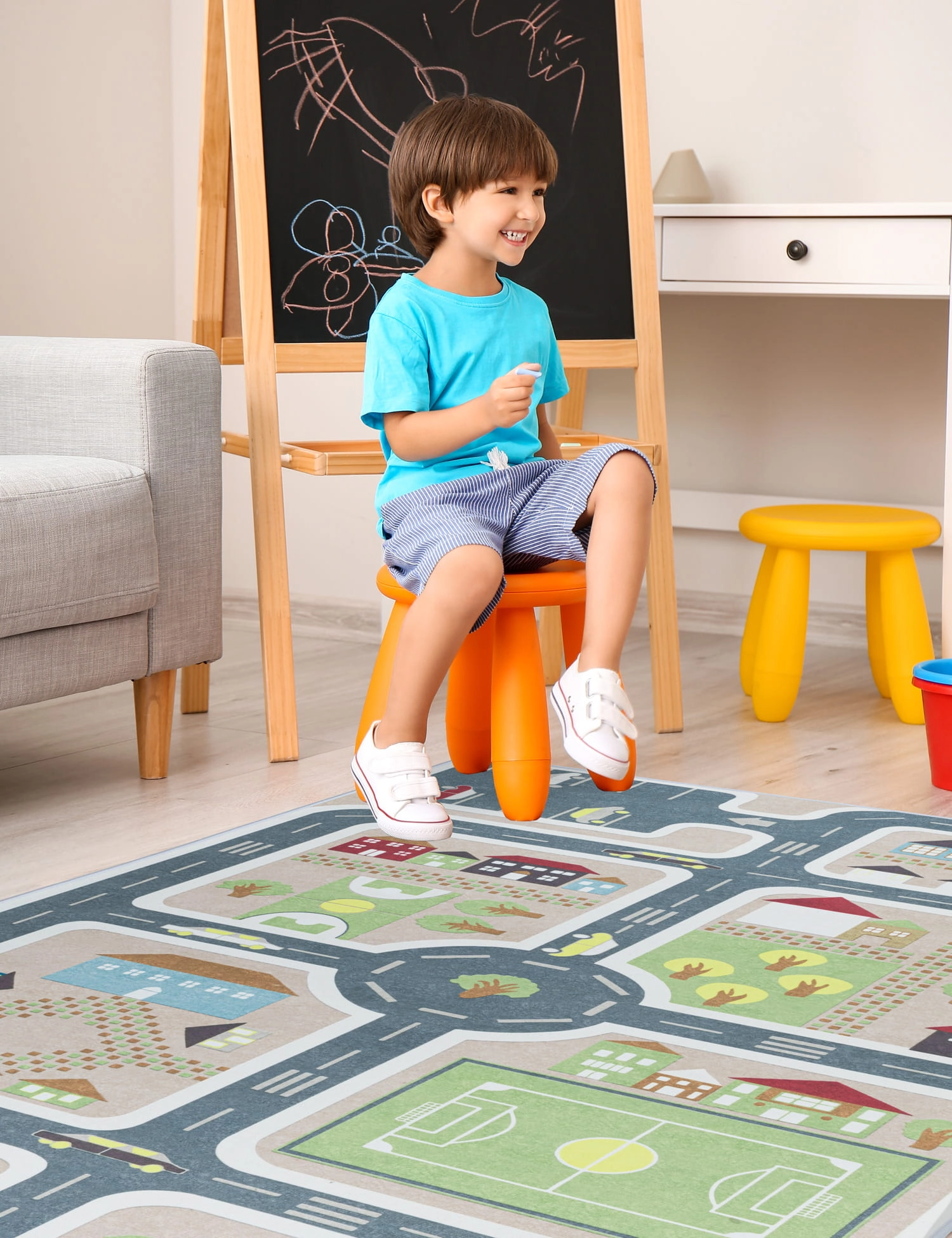 Dywan dziecięcy ulice to doskonała alternatywa dla klasycznych dywanów dziecięcych. Niezwykle praktyczny i wygodny element wyposażenia, który zapewni doskonałe miejsce do spędzania czasu na podłodze. Dzieci mogą wędrować uliczkami, układać własne trasy dla samochodów, organizować miasteczko dla swoich lalek lub tworzyć całe historie i scenariusze. Dywan dla dzieci to doskonałe narzędzie do rozwijania umiejętności poznawczych, społecznych i motorycznych.