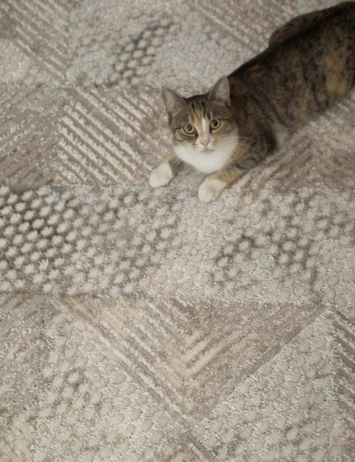 Niezwykle miły i przyjemny w dotyku, charakteryzuje się niskim, gęstym runem o dwóch wysokościach. Wzór jest tkany kilka milimetrów wyżej a w zależności od oświetlenia oraz kąta padania światła daje inny efekt kolorystyczny, mieniąc się i niezwykle atrakcyjnie połyskując.