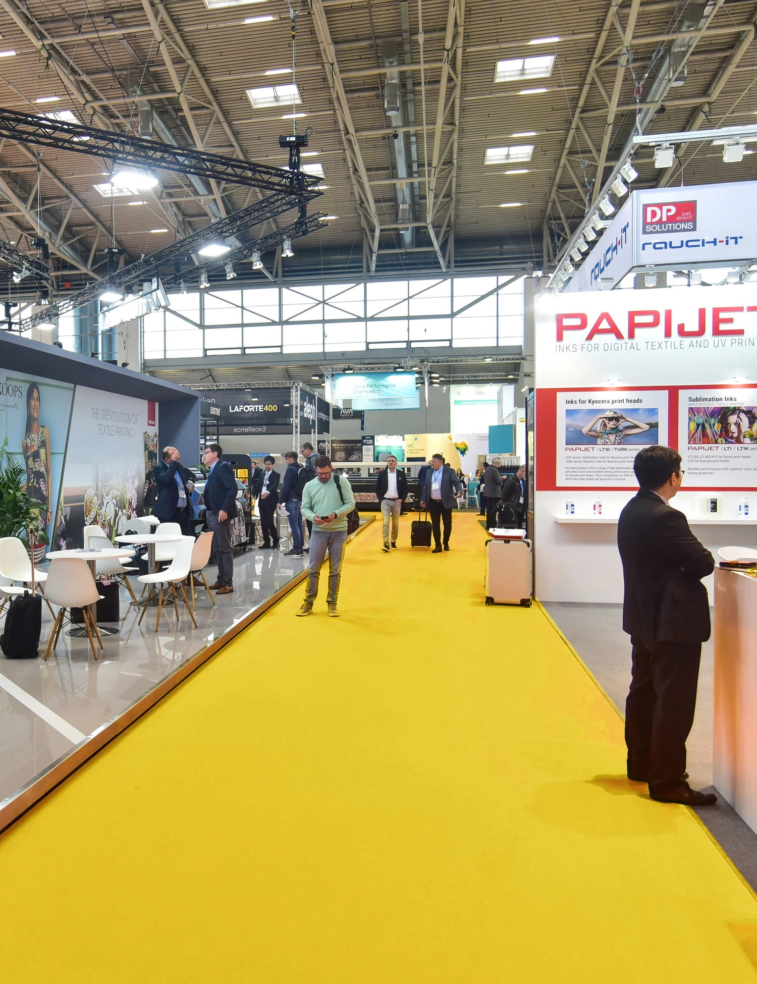 Tworzenie ścieżek lub obszarów: Żółta wykładzina może być używana do wyznaczenia ścieżek lub obszarów na stoisku, co pomaga w organizacji przestrzeni i prowadzeniu klientów przez wystawę.